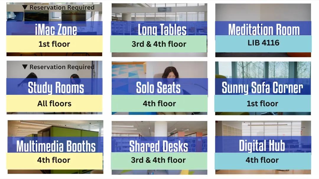 Nine dynamic spots, three different vibes! Visit this link to learn more about library spaces. Wherever you choose, please follow the rules and respect the space for everyone’s use.