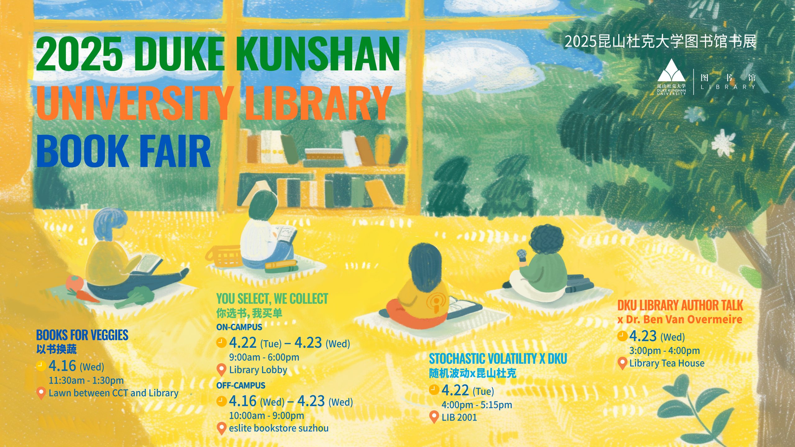 We look forward to welcoming you to the 2025 Duke Kunshan University Library Book Fair events! If you have any questions, please contact the Library at dkulibrary@dukekunshan.edu.cn.
