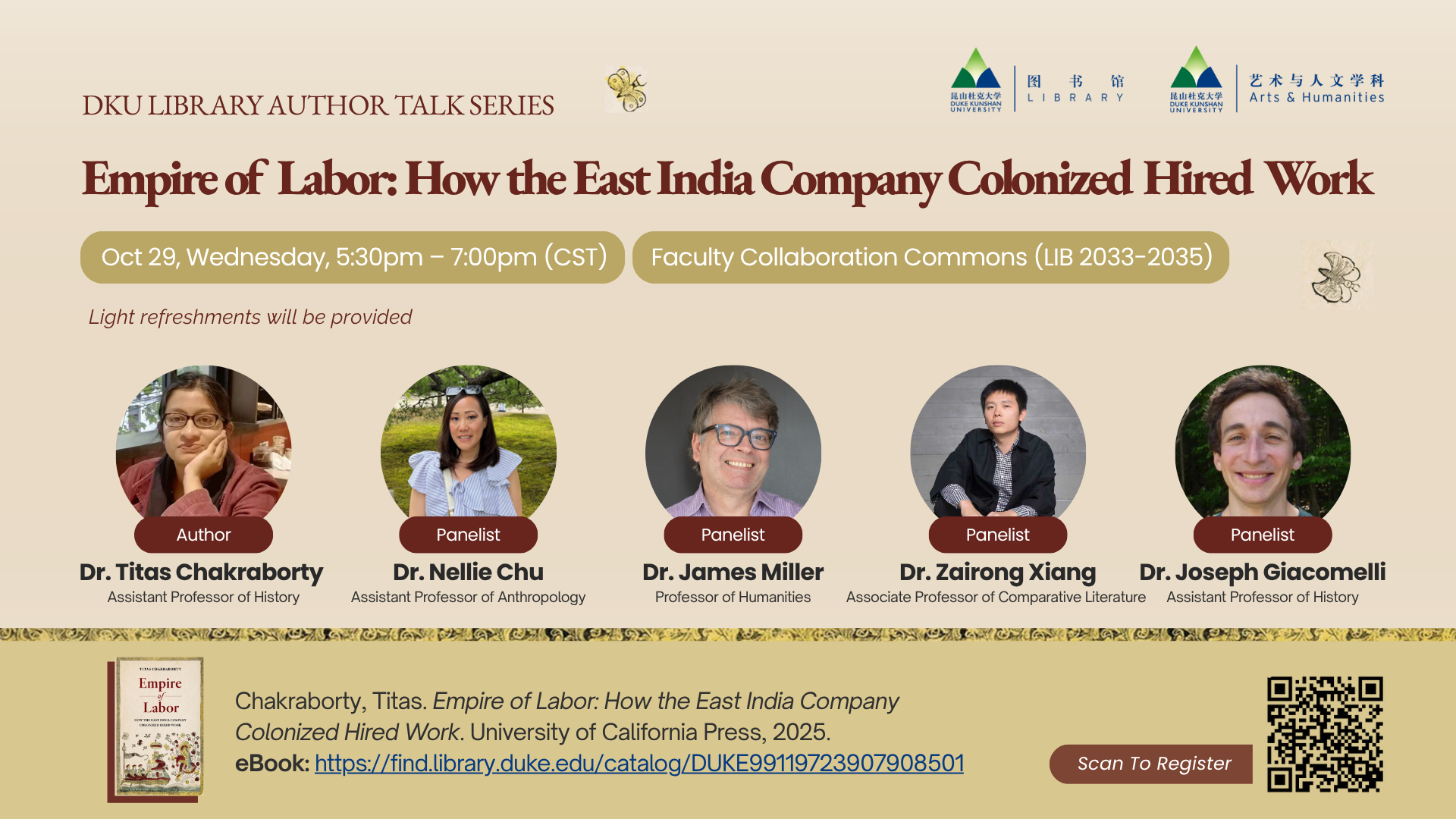 We are honored to welcome Dr. Titas Chakraborty, Assistant Professor of History at Duke Kunshan University (DKU) and author of Empire of Labor: How the East India Company Colonized Hired Work, to share insights from her book. The event will be presented as a panel discussion, featuring four other panelists from DKU: Dr. James Miller, Professor of Humanities, Dr. Nellie Chu, Assistant Professor of Anthropology, Dr. Zairong Xiang, Associate Professor of Comparative Literature, and Dr. Joseph Giacomelli, Assistant Professor of History.