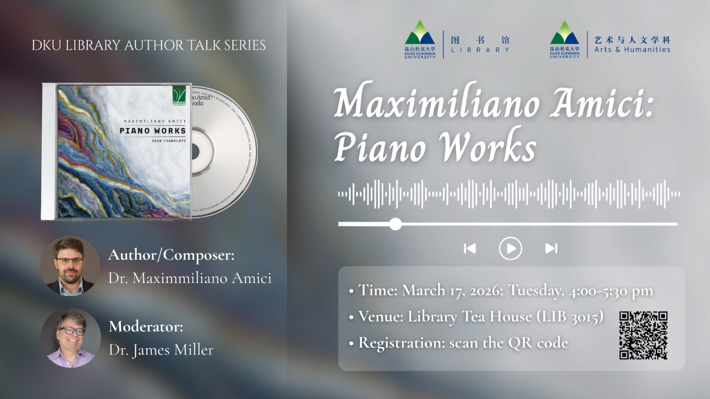 Duke Kunshan University (DKU) Library and the Division of Arts and Humanities are pleased to invite you to the latest event in the DKU Library Author Talk Series, titled “Maximiliano Amici: Piano Works.” We are privileged to have Dr. Maximiliano Amici, a professor of Music and Composition at DKU, to introduce his newly published CD in 2025. Dr. James Miller will serve as the moderator of the event.