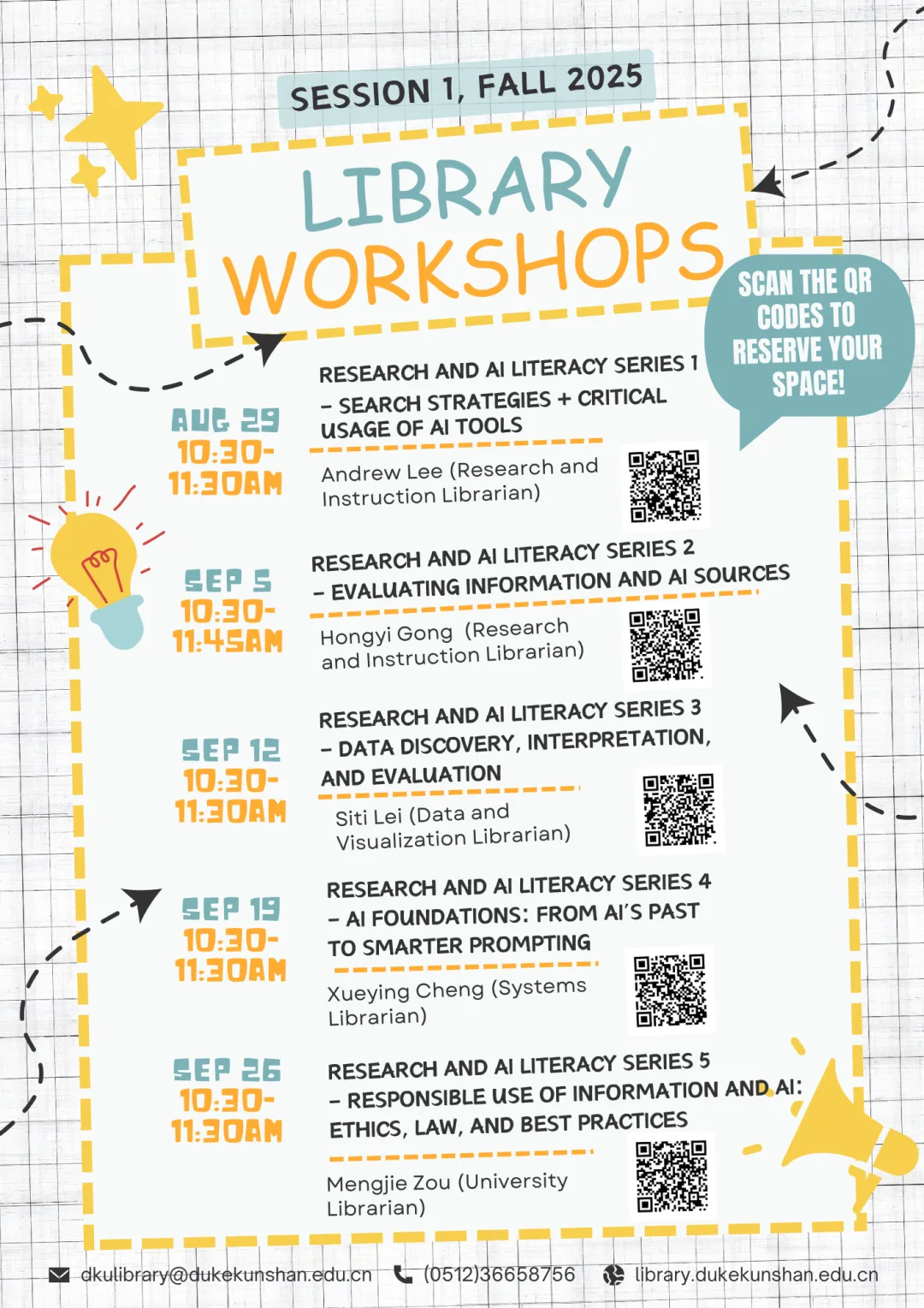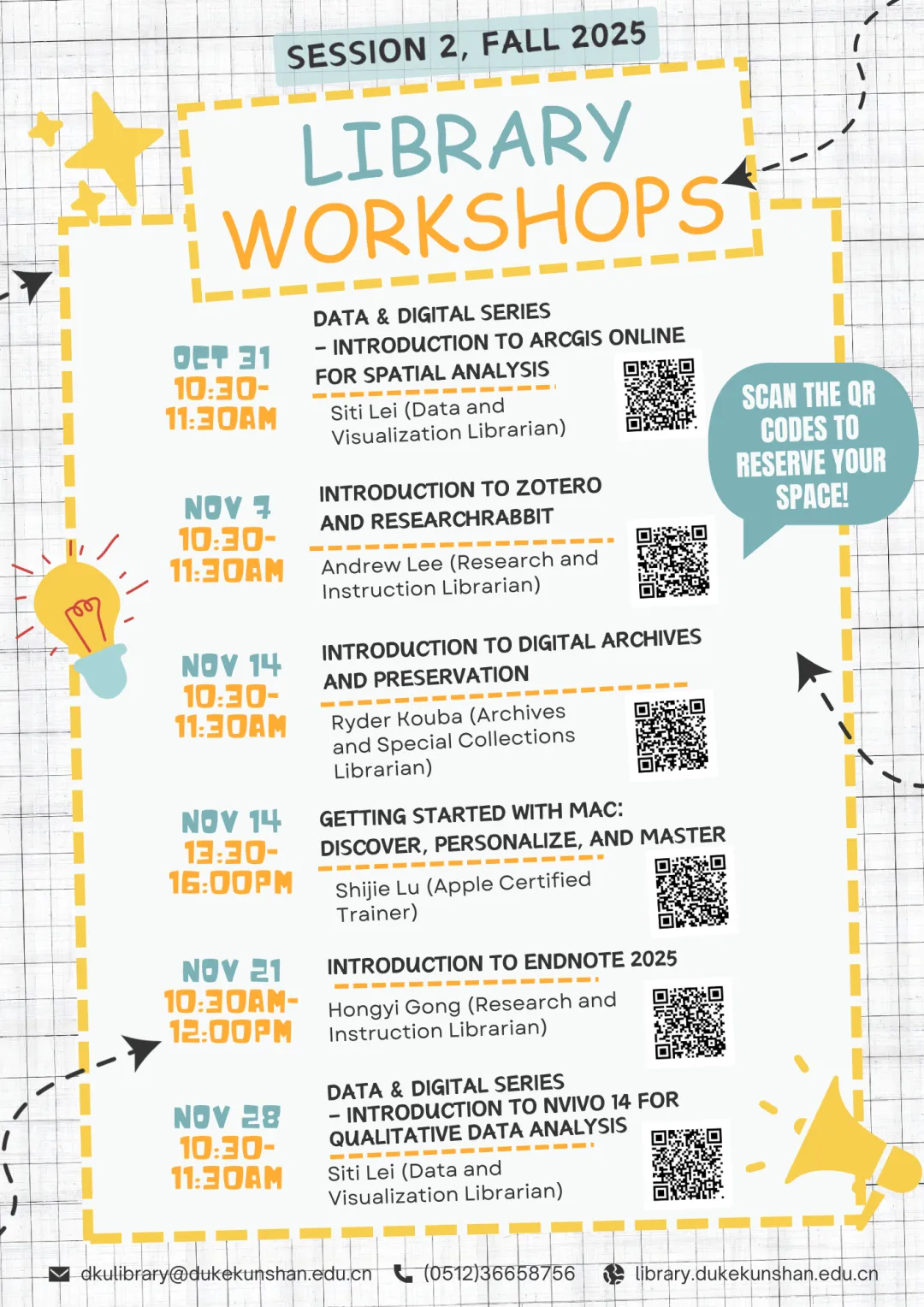 Check out our scheduled library workshops in Fall 2025. Scan the QR codes to register for specific sessions.