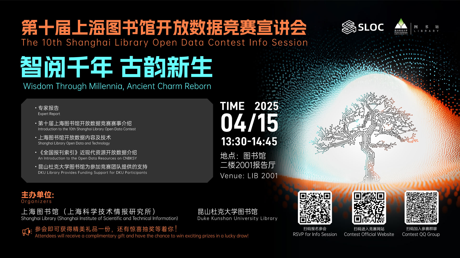 In addition, DKU Library will provide limited funding support opportunities to contest participants from DKU. Faculty are also welcome to participate as advisors; DKU Library will provide appropriate support, and participating faculty will have a chance to win the Outstanding Advisor Award in the contest.