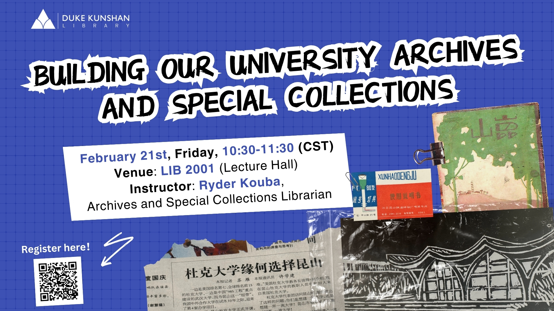 As DKU continues to grow, documenting its history administratively, intellectually, and culturally is important for a variety of reasons. This workshop will discuss how the DKU Community can help support building our archives. Additionally, while DKU’s Special Collections are in its infancy, a show-and-tell of some highlights will hopefully generate interest and discussion in how they can be utilized to support the University’s teaching and research mission.