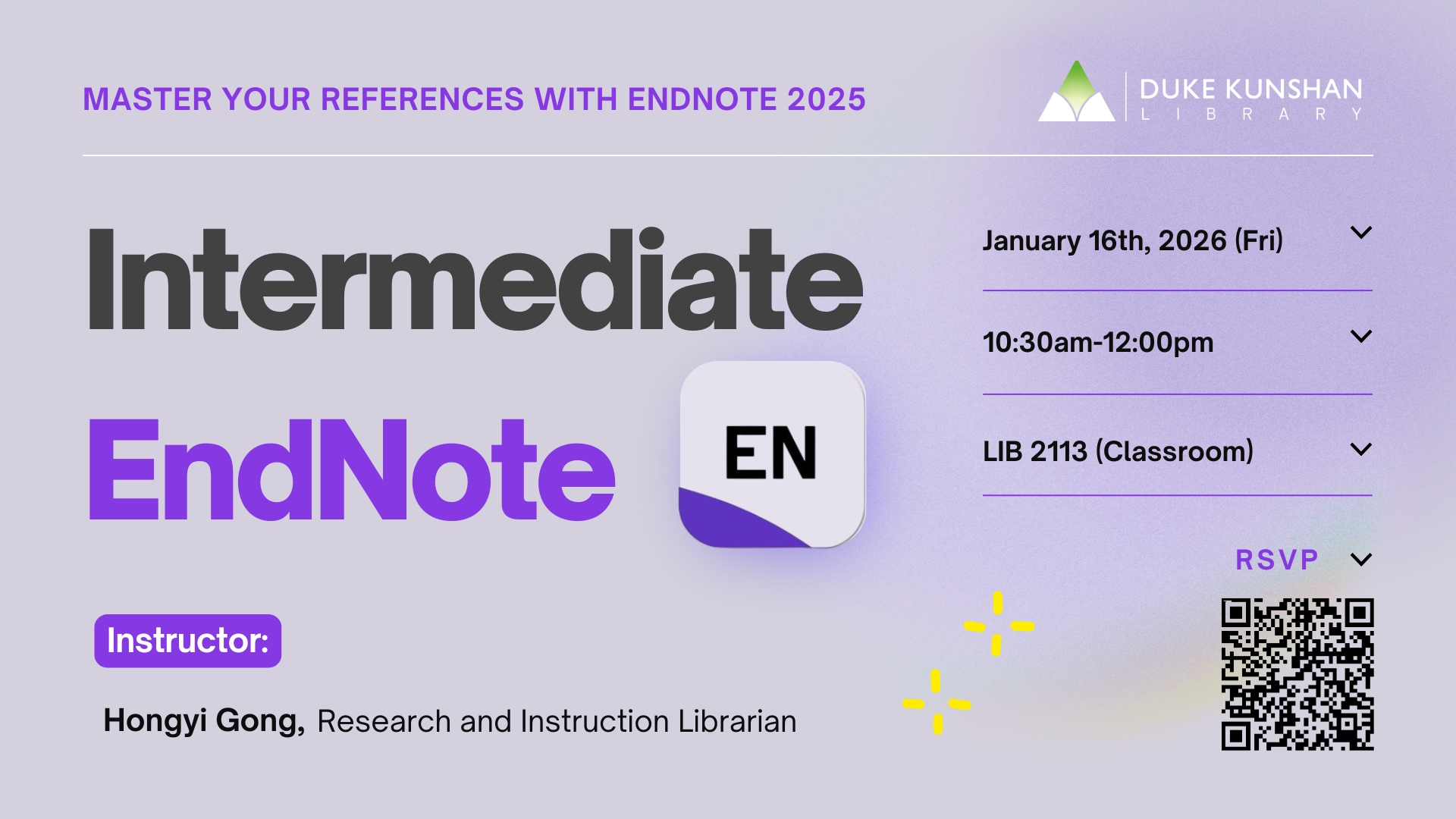 Please download and install EndNote 2025 prior to attending the workshop. Download link and installation instructions are available at: https://library.dukekunshan.edu.cn/citation-management-tools/#endnote. Please bring your laptop to attend this workshop.