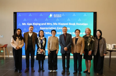 On November 13, 2025, Duke Kunshan University (DKU) Library and the Office of Development and Alumni Relations hosted the “Donated Books Appreciation Ceremony & Conversation with Dr. Gao Xiqing”, honoring Mr. Gao and his wife, Mrs. Ma Xiaowei, for their generous donation of more than 800 volumes from their personal collections.