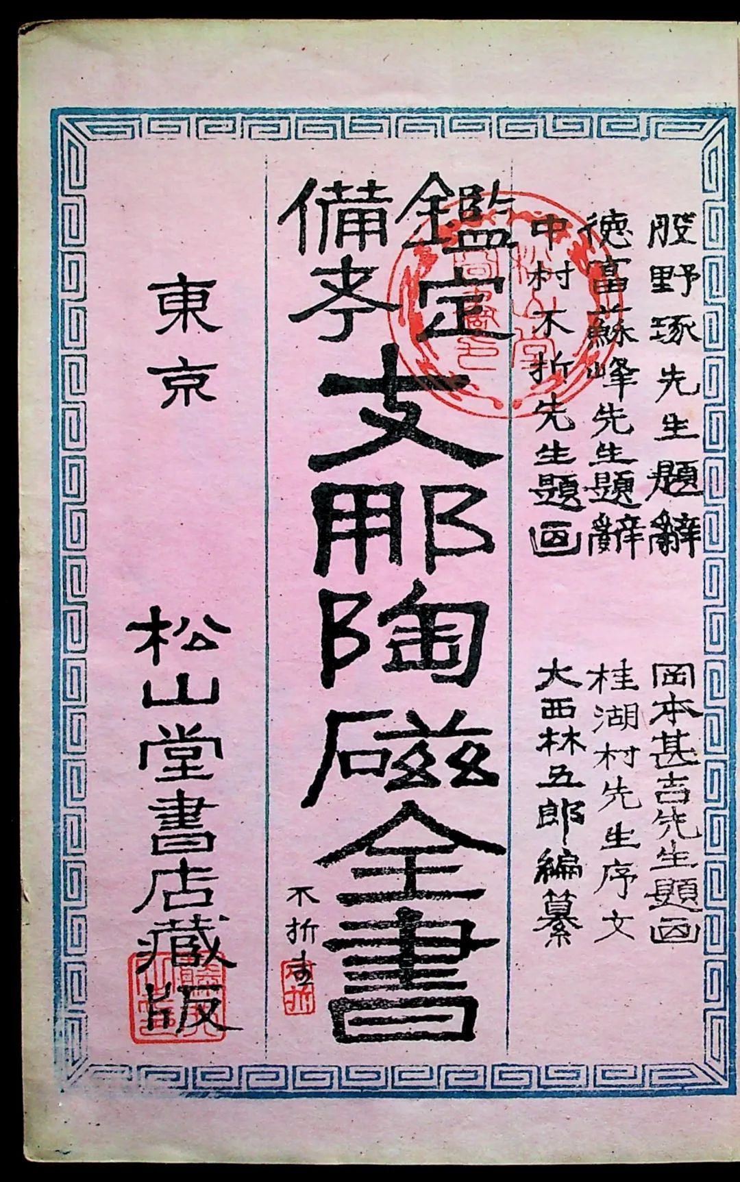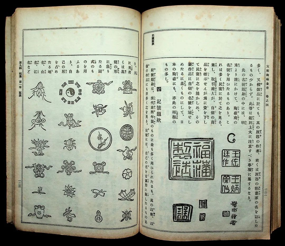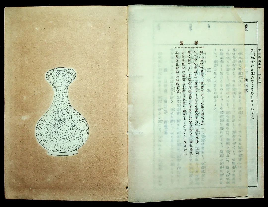 The four volume set 《鑑定備考支那陶磁全書》 (Kantei Biko Shina Toji Zensho/The Complete Book of Chinese Ceramics) is a reference guide to Chinese ceramics published in Tokyo in 1917 and provides details on the ceramics industry in China from the Zhou to Qing dynasties.