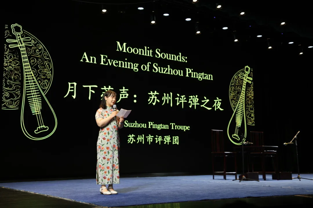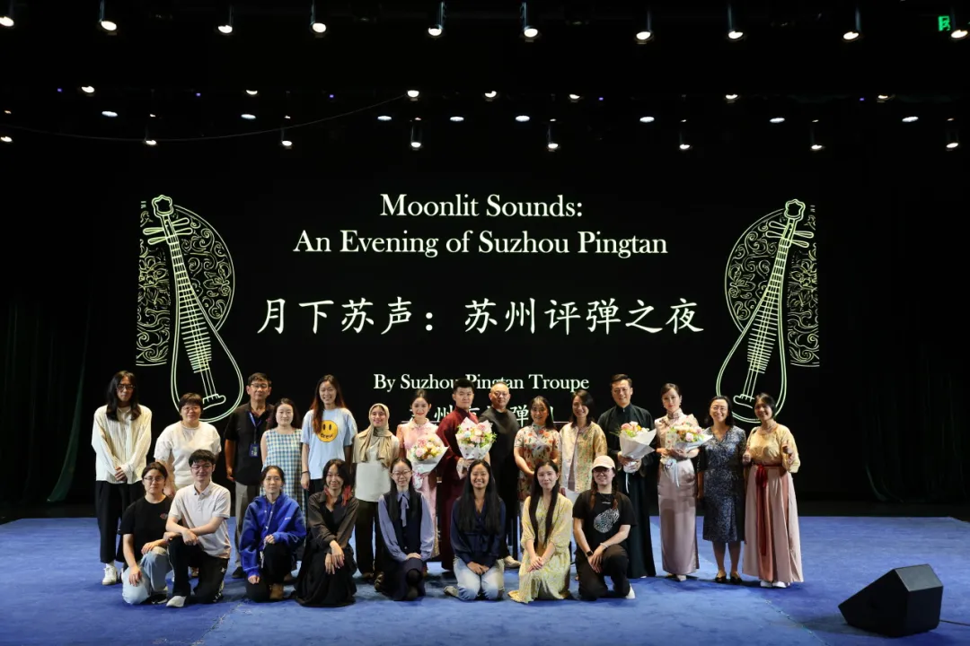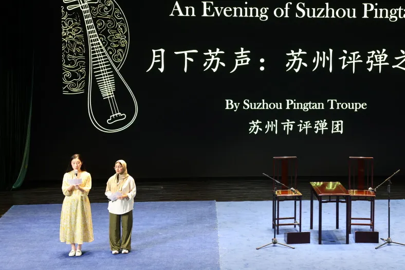 On the evening of September 25, 2025, Duke Kunshan University (DKU) Library and the Office of Student Experience hosted the Suzhou Pingtan Troupe for its first performance on campus, presenting “Moonlit Sounds: An Evening of Suzhou Pingtan” at the CCT Theater. The event, held under the bright autumn moon and ahead of China’s National Day, attracted hundreds of attendees from both the DKU community and the local public, offering a vivid introduction to the rich traditions of Jiangnan culture.