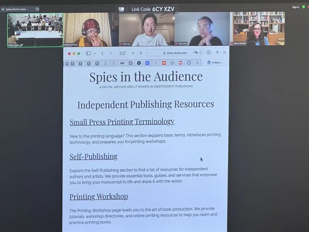 What is special about this book is that DKU students played an active role in bringing this project to life. Over several semesters, Dr. Anderson’s students conducted research, transcribed interviews, and built a companion website archive – Spines in the Audience – to showcase research findings (https://sites.duke.edu/spiesintheaudience/). With several of these student contributors soon to graduate, this author talk also served as a celebration of their achievements and a reunion of the collaborative team. Sydney Brown, one of the student researchers, shared her experience in bibliography research, illustrating their thoughts and efforts in making good resources available to others.